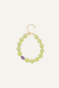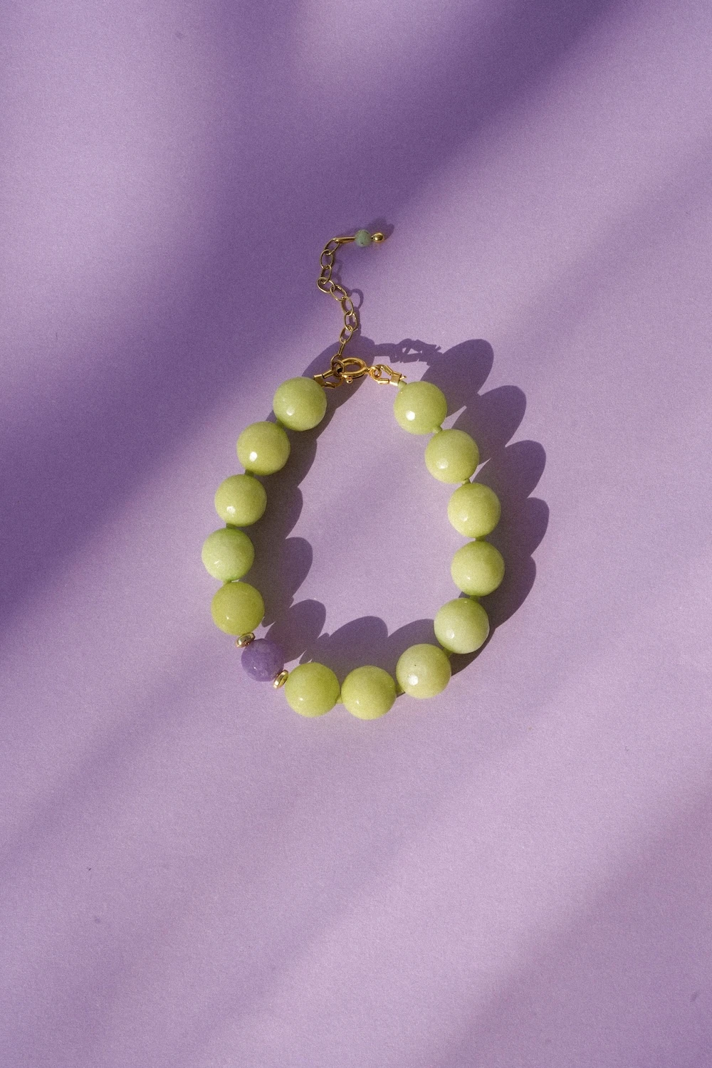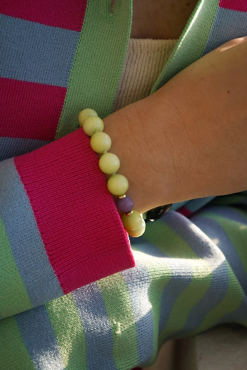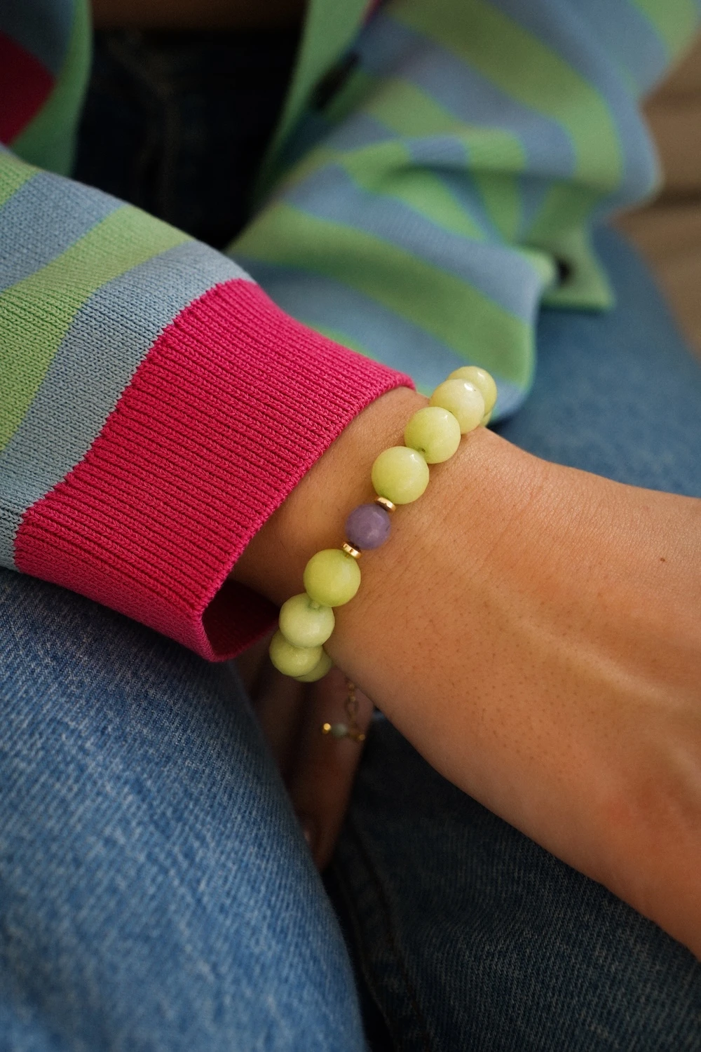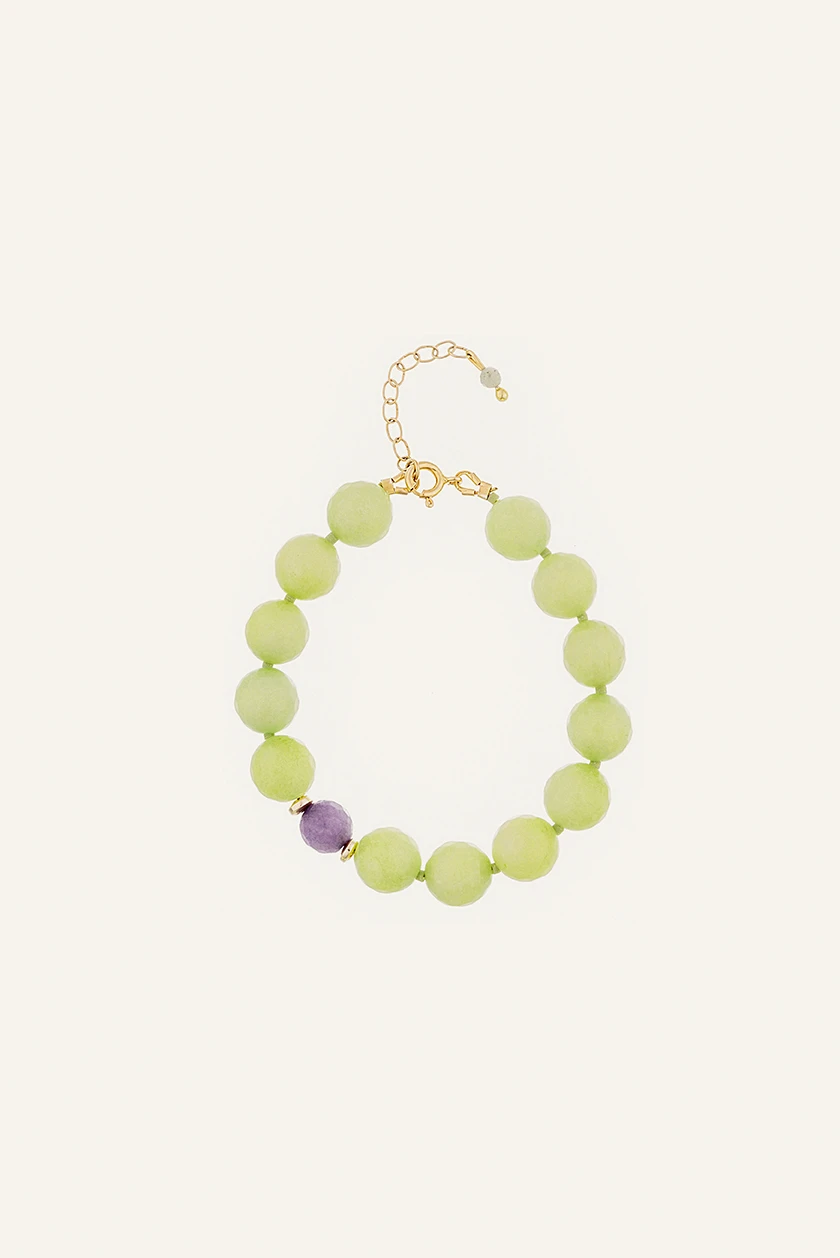 Bransoletka Aura z kolekcji Prismato wyjątkowa kompozycja kamieni jadeitu oraz anhydrytu, wykończona przedłużką ze srebra próby 925. Inspiracją dla modelu są kolory światła i spektrum pryzmatu. Delikatny zieleń w połączeniu z fioletowymi kamieniami tworzy elegancki, ale nowoczesny dodatek.