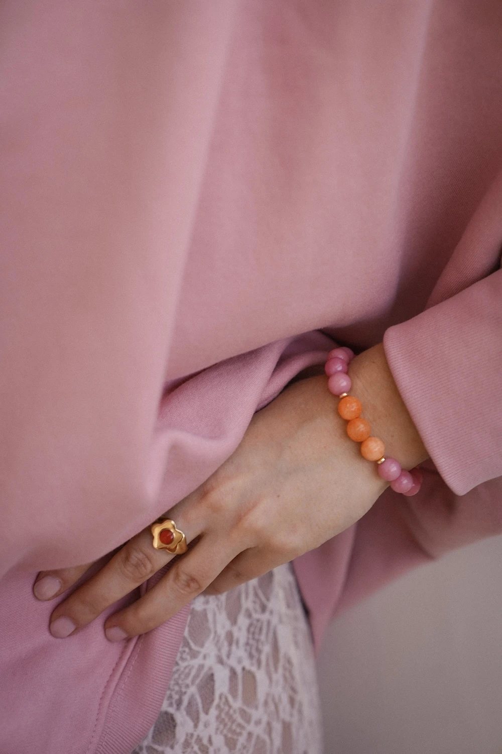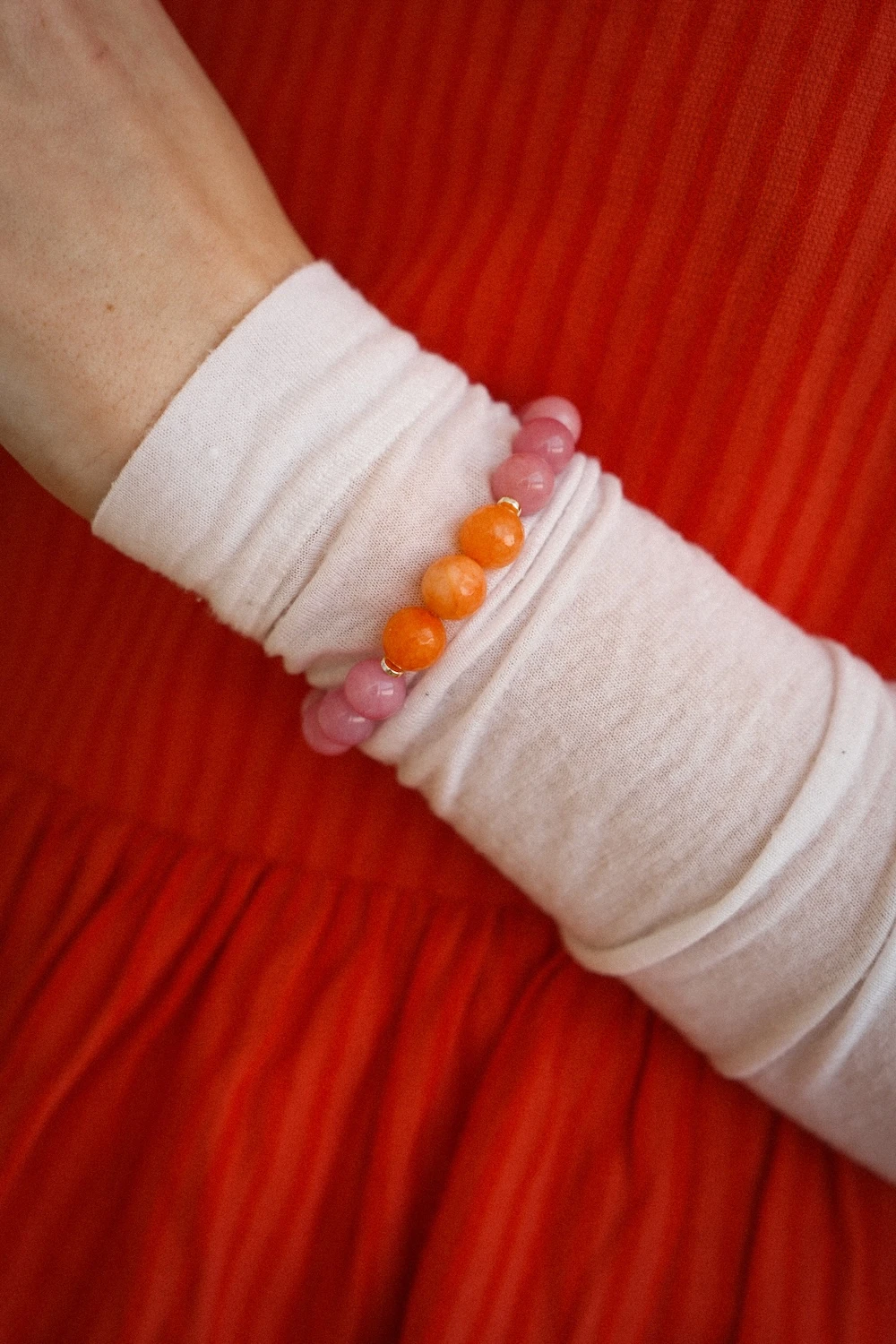 Bransoletka Lush z kolekcji Prisma towyjątkowa kompozycja kamieni jadeitu i chalcedonu. Inspiracją dla modelu są kolory światła i spektrum pryzmatu. Pomarańcz w połączeniu z różowymi kamieniami tworzy soczysty, nowoczesny dodatek.