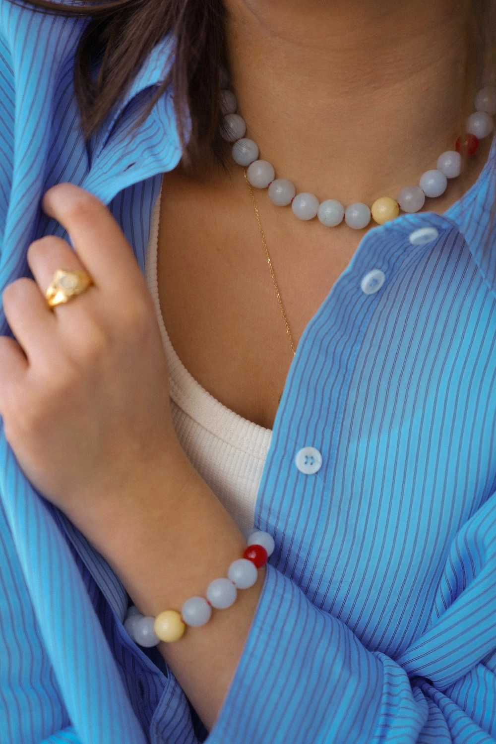 Bransoletka Sky z kolekcji Prisma to wyjątkowa kompozycja kamieni jadeitu i agatu. Inspiracją dla modelu są kolory światła i spektrum pryzmatu. Delikatny błękit w połączeniu z czerwonymi i żółtymi kamieniami tworzy elegancki, ale nowoczesny dodatek.