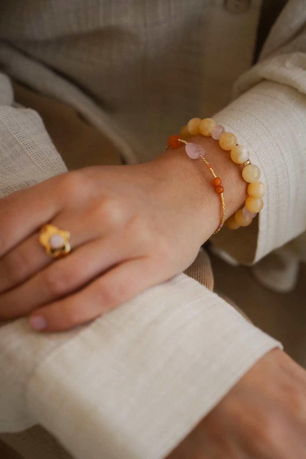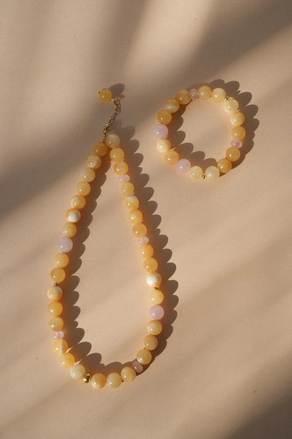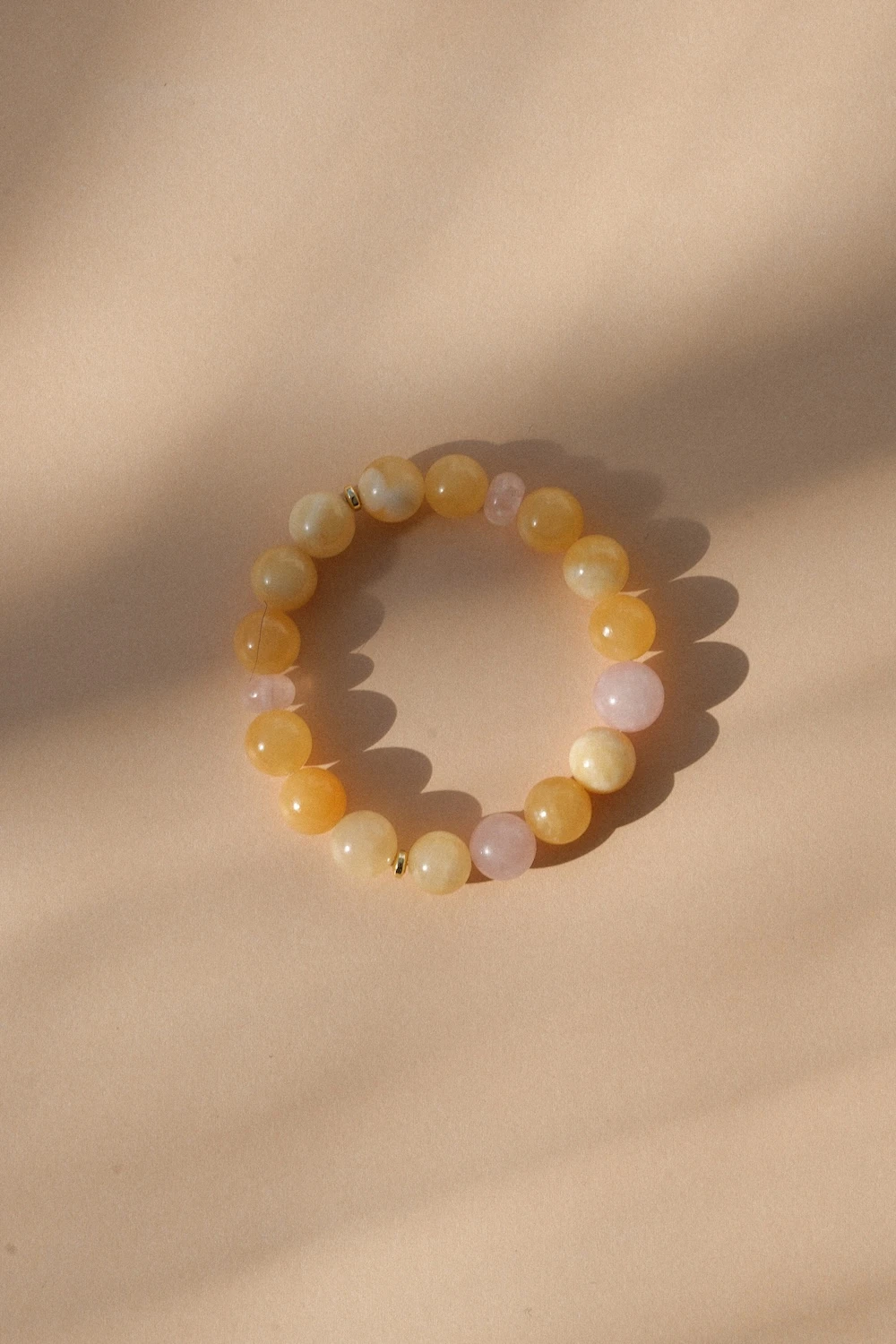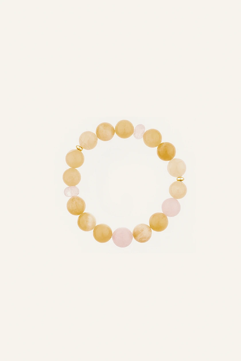 Bransoletka Solar z kolekcji Prisma to wyjątkowa kompozycja kamieni nefrytu bursztynowego i kwarcu różowego. Inspiracją dla modelu są kolory światła i spektrum pryzmatu. Delikatny masełkowy żółty w połączeniu z różowymi kamieniami i złotymi przekładkami tworzy elegancki, ale nowoczesny dodatek.
