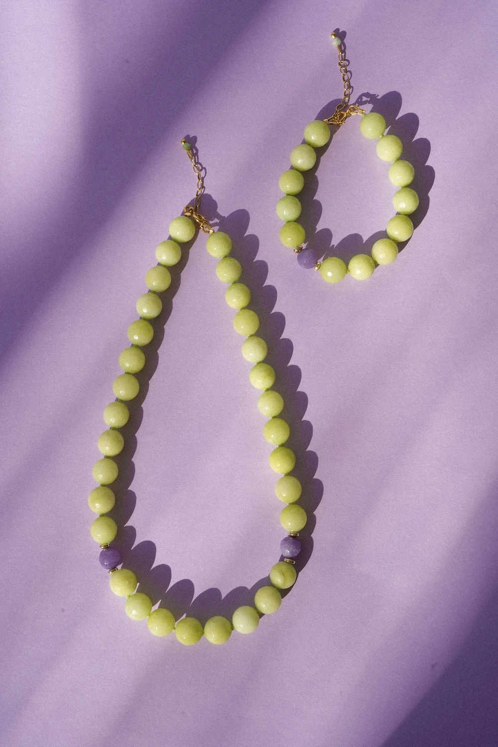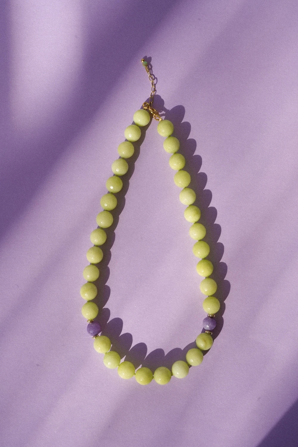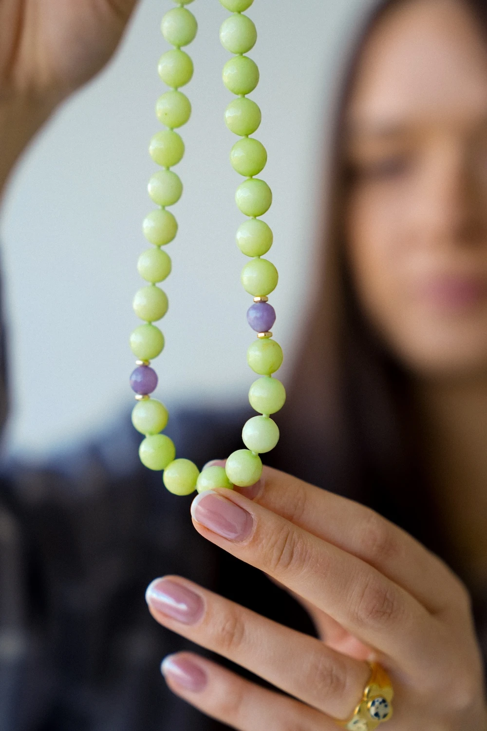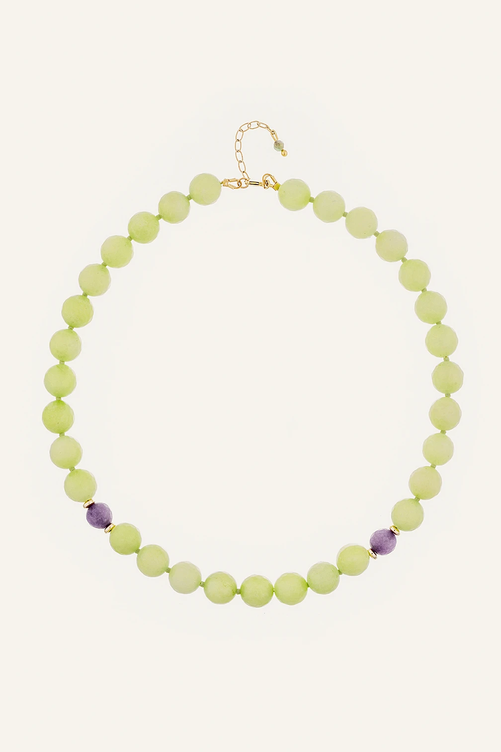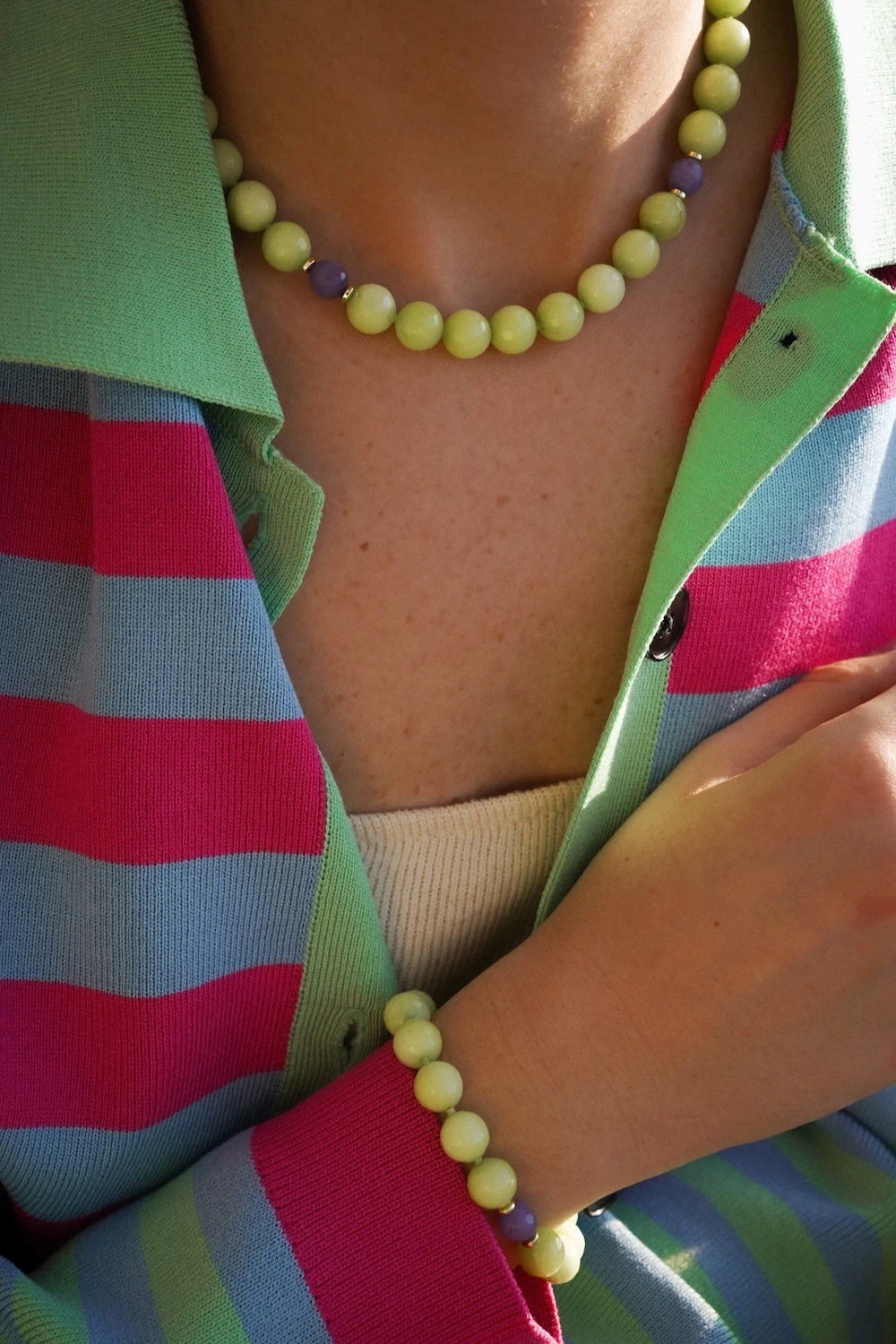 Naszyjnik Aura z kolekcji Prisma to wyjątkowa kompozycja kamieni jadeitu oraz anhydrytu, wykończona przedłużką ze srebra próby 925. Inspiracją dla modelu są kolory światła i spektrum pryzmatu. Delikatny zieleń w połączeniu z fioletowymi kamieniami tworzy elegancki, ale nowoczesny dodatek.