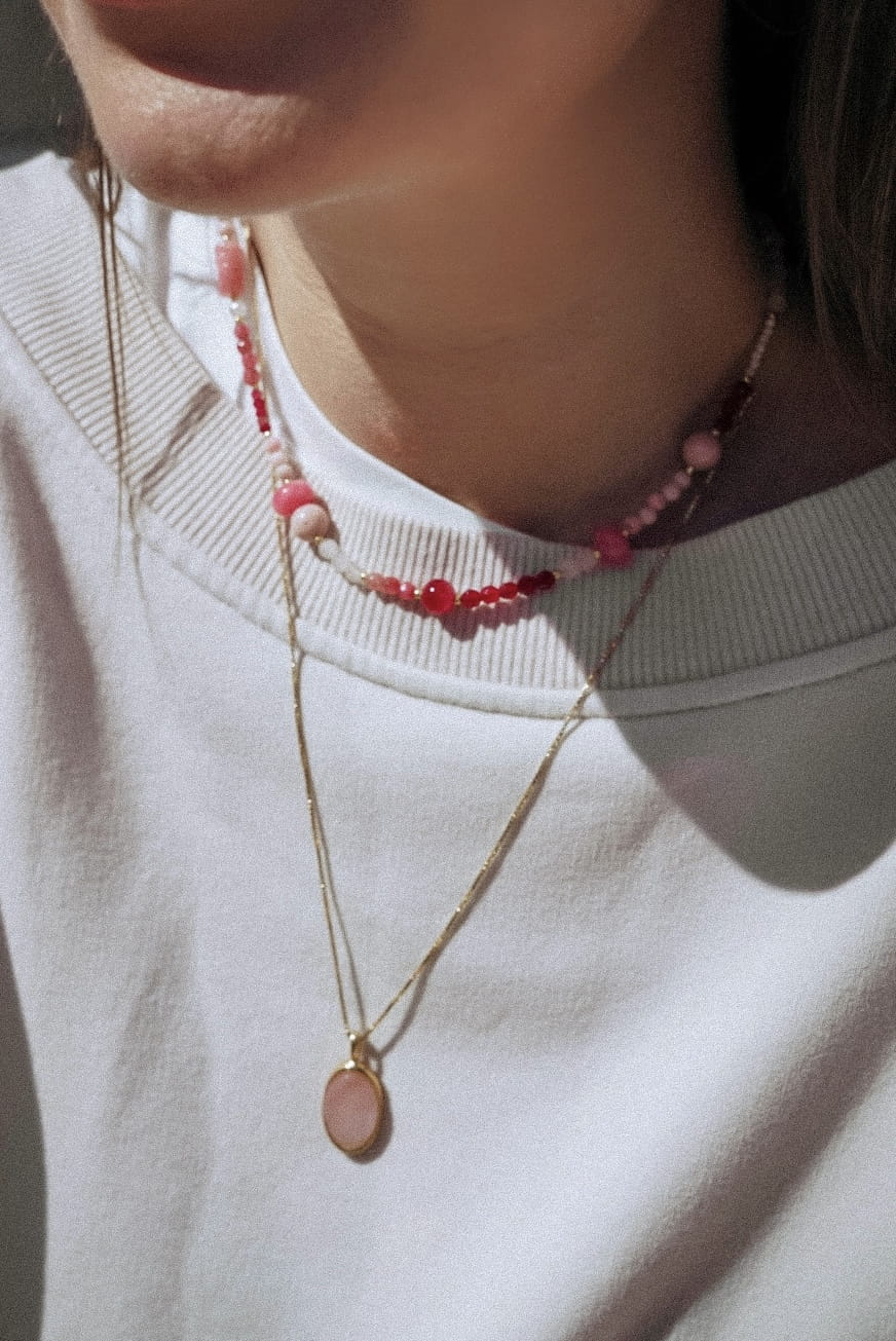 Opal – kamień, który emanuje radością i pozytywną energią. Uważa się, że wspiera wyobraźnię i kreatywność, a także przynosi szczęście. Opal jest znany z niezwykłych efektów świetlnych, co sprawia, że każdy naszyjnik z jego udziałem jest unikalny i zachwycający.